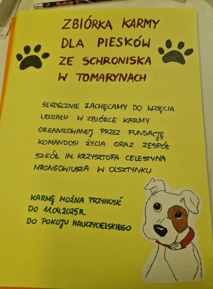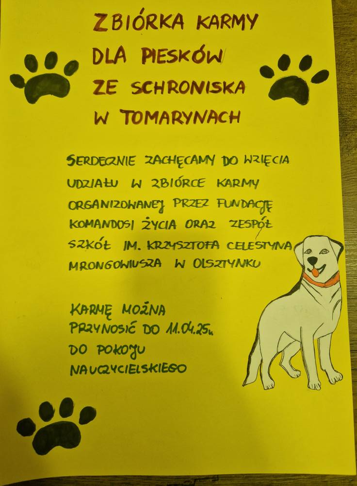 Czas na kolejną misję dobra! Fundacja Komandosi Życia wraz z #KlubemWolontariatu, przy ogromnym wsparciu kadra i uczniów Zespołu Szkół im. Krzysztofa Celestyna Mrongowiusza w Olsztynku, organizuje zbiórkę dla podopiecznych Międzygminnego Schroniska dla Bezdomnych Zwierząt w Tomarynach.